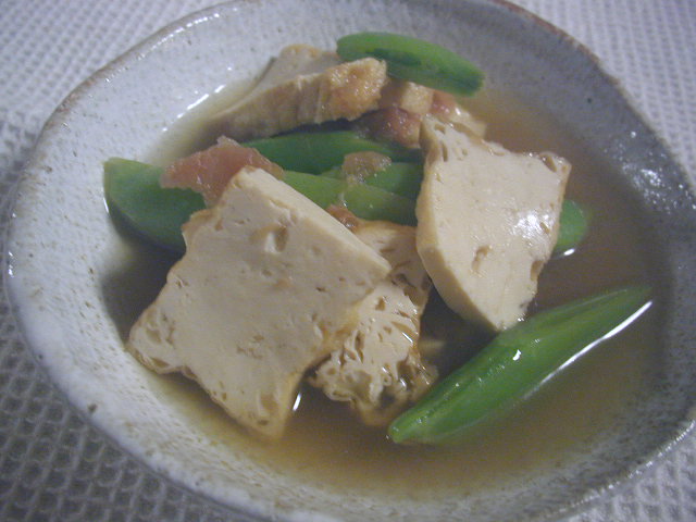 【 作り方 】 1 厚揚げはペーパータオル等で油を拭いて縦半分に切り、5mm厚に切る。スナップえんどうは ヘタと筋を取る。大きいものは半分の長さに切る。梅干は種を外し、実を粗く刻む。 2 なべにだし汁と梅干の種を加えて火にかけ、煮立ったら厚揚げを加え、酒、しょうゆも加えて 2〜3分煮る。続いてえんどうと刻んだ梅干しの実を加えてさっと煮る。えんどうに火が通ったら 汁ごと器に盛っていただく。