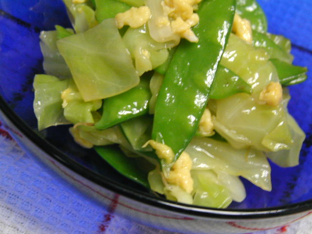 1 さやえんどうはヘタと筋を取る。キャベツは塩少々を加えた熱湯で1分ほどゆでて取り出し、
